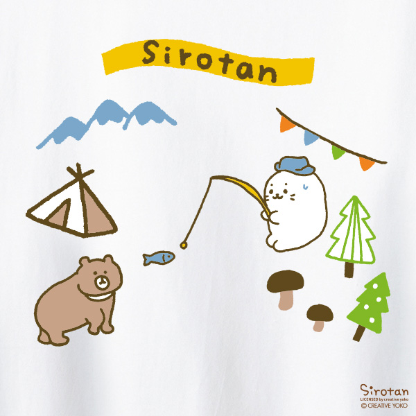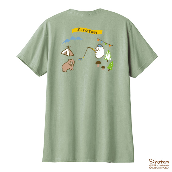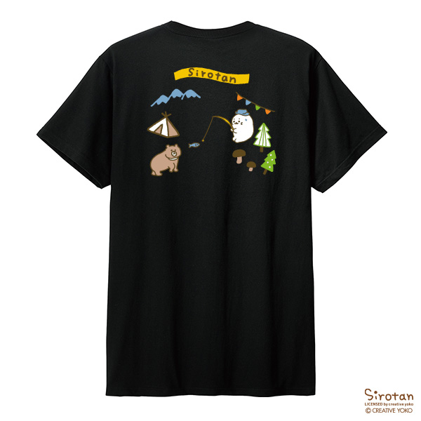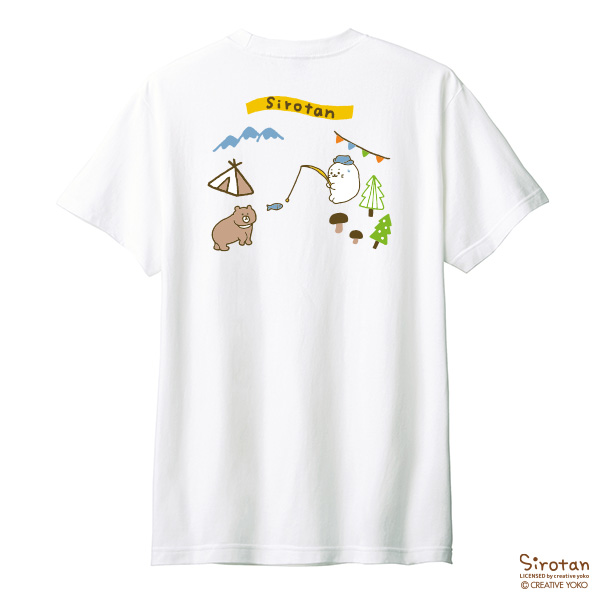 フロントのしろたんオリジナルペナント刺繍と、背中にキャンプを楽しむしろたんがプリントされた、かわいいTシャツです。