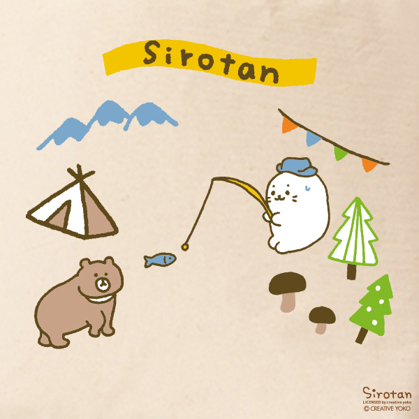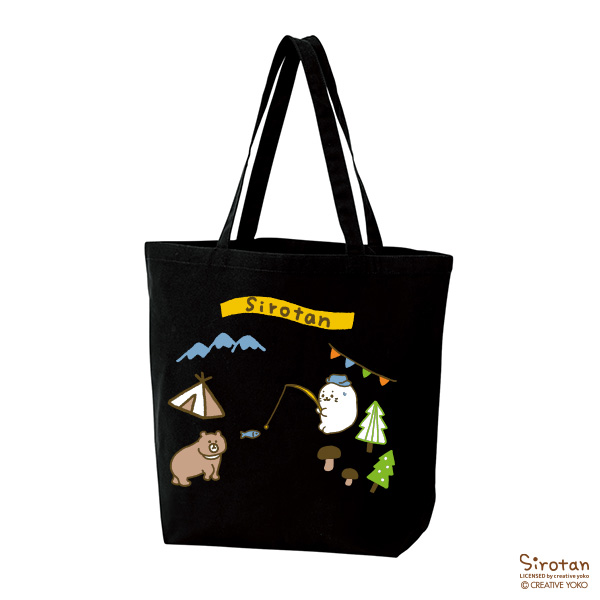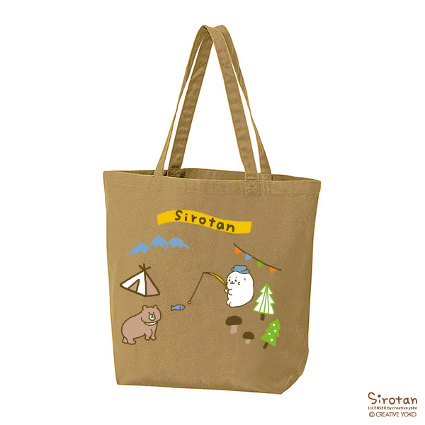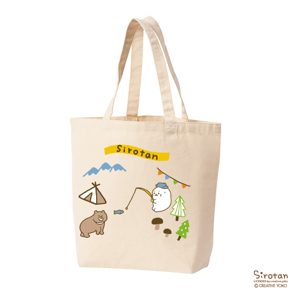 しろたんオリジナルペナント刺繍と、キャンプを楽しむしろたんのプリント柄、両面デザインが楽しめる、かわいいトートバッグです。