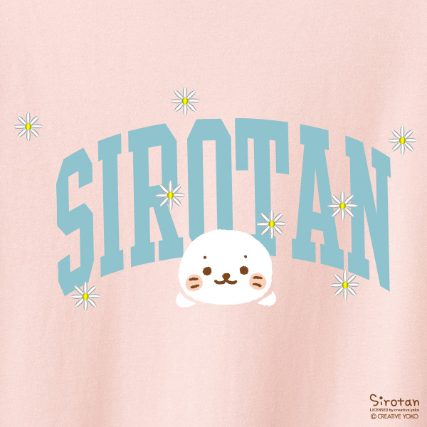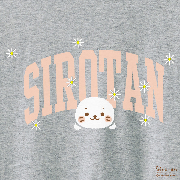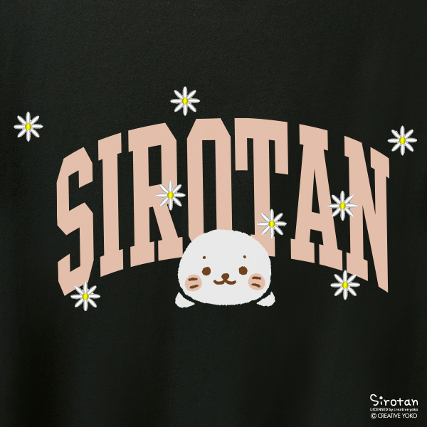 しろたんが真ん中にちょこんといるカレッジデザインのプリントスウェットに、リメイク風の小花刺繍をちらしました。